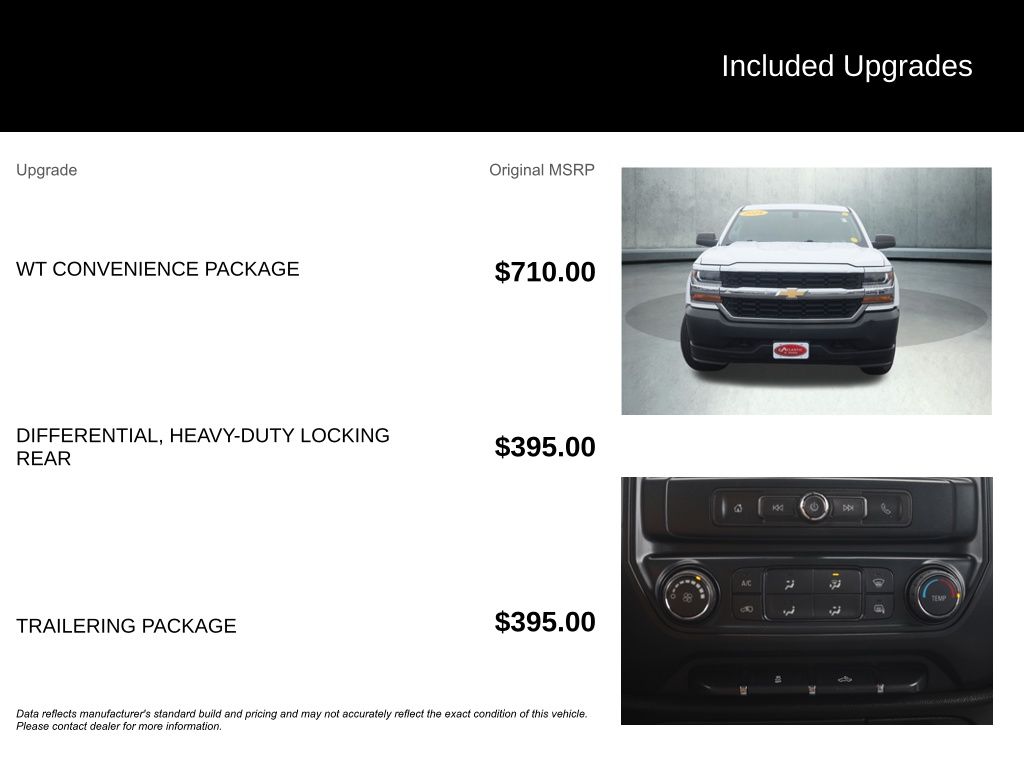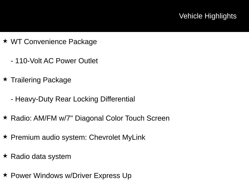 Versatility is at the heart of the Silverado 1500 WT. The WT Convenience Package adds tinted windows, a remote locking tailgate, and power mirrors, while the Trailering Package equips you with a trailer hitch, 7-pin and 4-pin connectors, and a heavy-duty locking rear differential for effortless towing.
