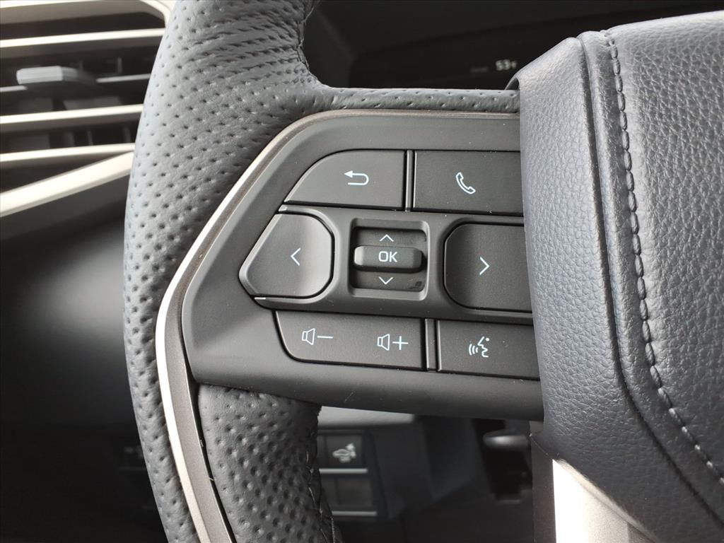 - Leather-wrapped manual tilt/telescopic steering wheel with phone, audio, display/infotainment, and Driver Assist controls