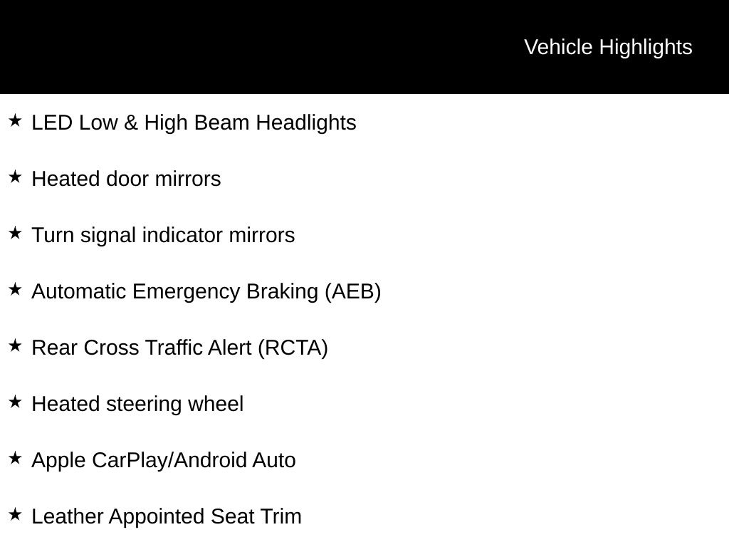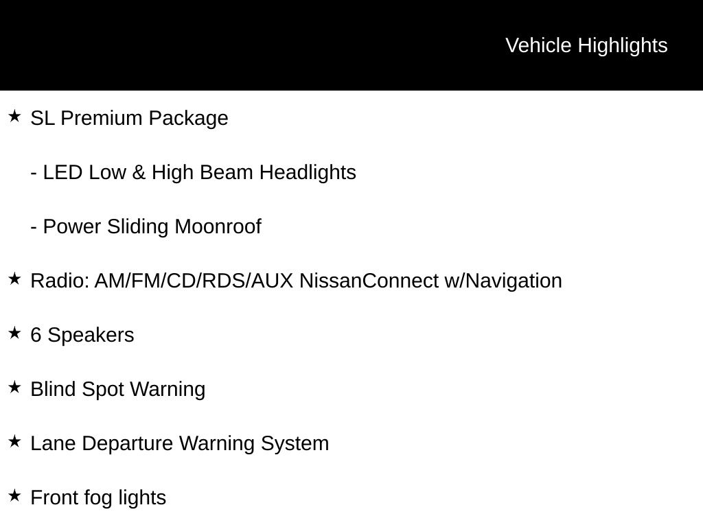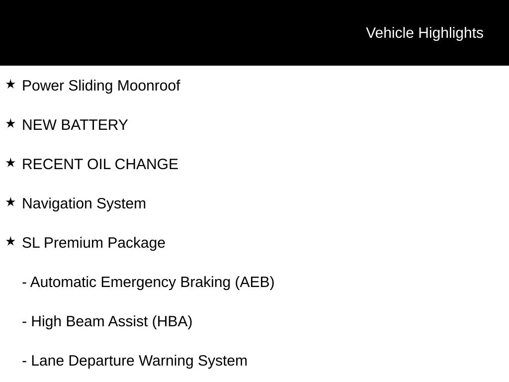 - SL PREMIUM PACKAGE: LED Low & High Beam Headlights, Power Sliding Moonroof, High Beam Assist (HBA), Automatic Emergency Braking (AEB), Pedestrian Detection, Lane Departure Warning (LDW), Intelligent Lane Intervention (I-LI)