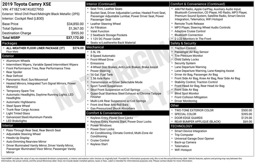 TOYOTA CERTIFIED!! **ONE OWNER, SPECIAL COLOR, TWO-TONED, ONLY 36K MILES!!** Equipped with 19” BLACK MACHINED FINISHED ALLOY WHEELS, Vehicle Stability Control, Traction Control, Electronic Brake Distribution, Brake Assist, Smart Stop Technology, Electronic Power Steering , Pre-Collision System w/Pedestrian Detection, Lane Departure Alert w/Steering Assist, Auto High Beams, Full-Speed Range Dynamic Radar Cruise Control, HEATED POWER OUTSIDE MIRRORS, PANORAMIC POWER MOONROOF, BLIND SPOT MONITORING w/REAR CROSS TRAFFIC ALERT, BACKUP CAMERA, HEATED LEATHER FRONT SEATS, ENTUNE AUDIO 3.0 PLS w/JBL w/Clari-Fi 8" DISPLAY 9 SPEAKER AUDIO AM/FM/USB/AUX/BLUETOOTH, ANDROID AUTO + APPLE CARPLAY COMPATIBLE, Keyless Remote Entry!!