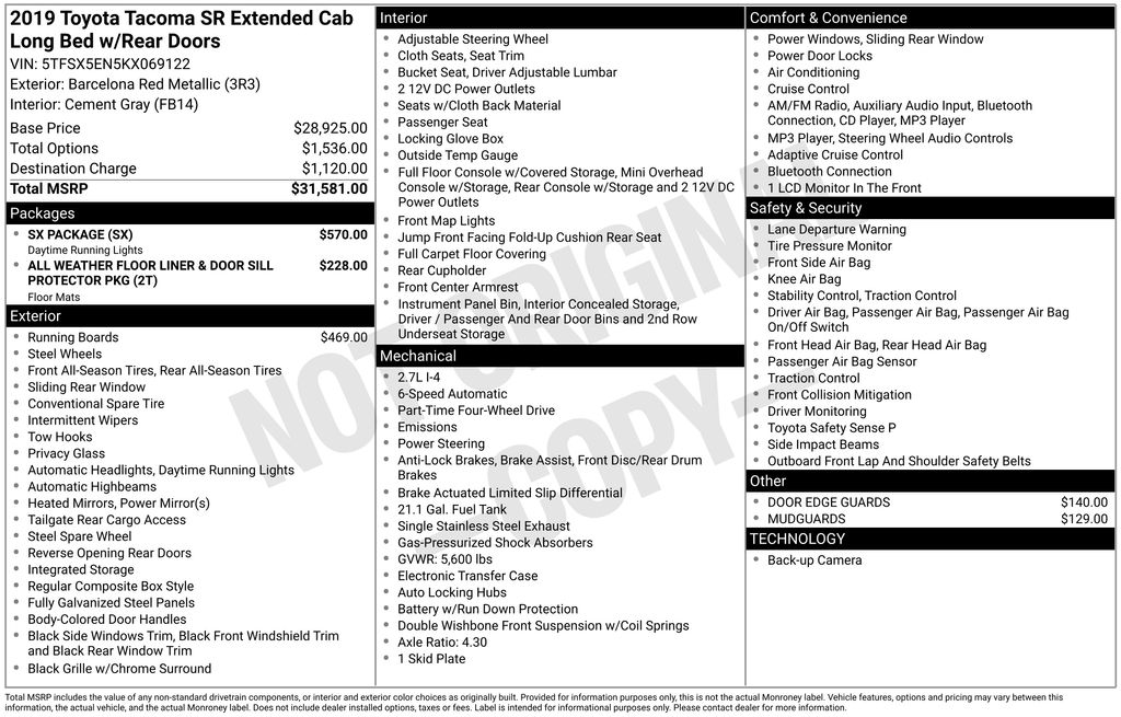 Safety is a top priority, and this Tacoma SR is equipped with a comprehensive suite of advanced safety technologies. Dual front and side impact airbags, anti-whiplash front head restraints, and electronic stability control provide peace of mind, while the Exterior Parking Camera Rear makes maneuvering a breeze.