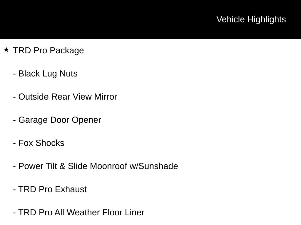 TOYOTA CERTIFIED!! **CLEAN CARFAX, ONE OWNER, NEW BRAKES & ROTORS, NEW OIL AIR & CABIN FILTERS, ONLY 27K MILES!!** Equipped with 17" TRD PRO FLOW-FORM ALLOY WHEELS, TRD TUNED FOX SHOCKS & SPRINGS, Multi Terrain Select & Crawl Control, Hill-Start Assist, Electronic Power Steering, Vehicle Stability Control, Traction Control, Electronic Brake Distribution, Brake Assist, Smart Stop Technology, Pre-Collision Sys w/Pedestrian Detection, Dynamic Radar Cruise Control, Lane Departure Alert, Auto High Beams, LED FOG LIGHTS, POWER OUTSIDE MIRRORS, POWER SLIDING REAR WINDOW/BLINDSPOT MONITORING w/REAR CROSS TRAFFIC ALERT, MULTI TERRAIN MONITOR, SOFTEX SEATS w/TRD LETTERING, BACKUP CAMERA, 8" TOUCHSCREEN PREMIUM 15 SPEAKER JBL AUDIO incl/SUBWOOFER & AMPLIFIER, INTEGRATED NAVIGATION, HD RADIO AM/FM/USB/BLUETOOTH, ANDROID AUTO + APPLE CARPLAY COMPATIBLE, Keyless Remote Entry!!