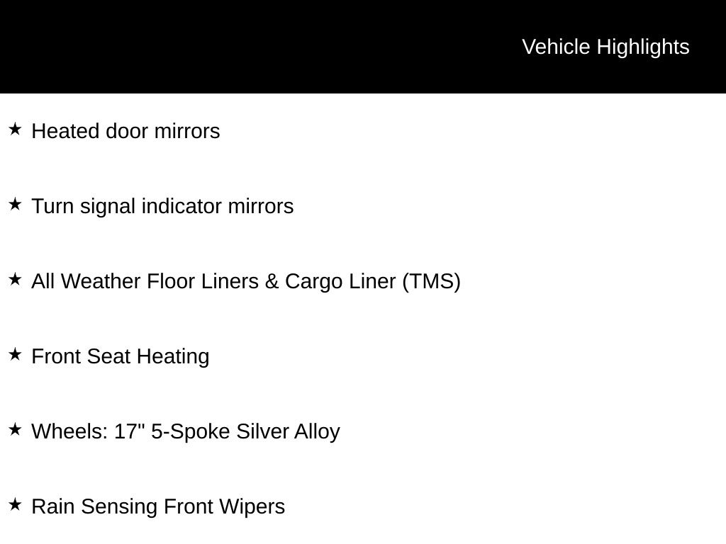 - Heated front seats Heated driver and front passenger seats