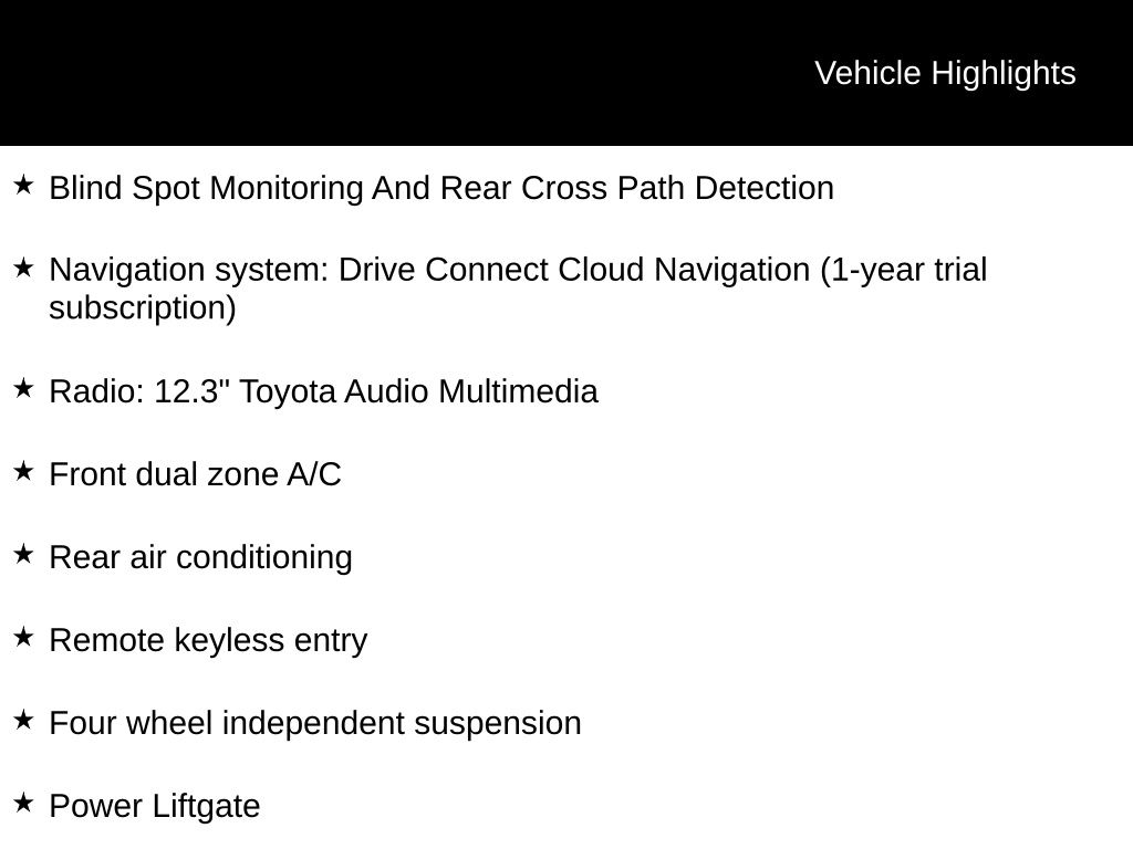 CARFAX One-Owner. Certified. Midnight Black Metallic 2024 Toyota Grand Highlander XLE AWD 8-Speed Automatic 2.4L 4-Cylinder Blind Spot Monitoring And Rear Cross Path Detection, 18" Aluminum Alloy Wheels, 3rd row seats: split-bench, Active Cruise Control, Apple CarPlay/Android Auto, Auto-dimming Rear-View mirror, Cross Bars (TMS), Electronic Stability Control, Exterior Parking Camera Rear, Four wheel independent suspension, Front dual zone A/C, Garage door transmitter: HomeLink, Heated door mirrors, Heated Front Seats, Illuminated entry, Leather Shift Knob, Leather steering wheel, Mudguards (TMS), Navigation system: Drive Connect Cloud Navigation (1-year trial subscription), Power Liftgate, Power passenger seat, Radio: 12.3" Toyota Audio Multimedia, Rear air conditioning, Reclining 3rd row seat, Remote keyless entry, SofTex Seat Trim, Turn signal indicator mirrors.