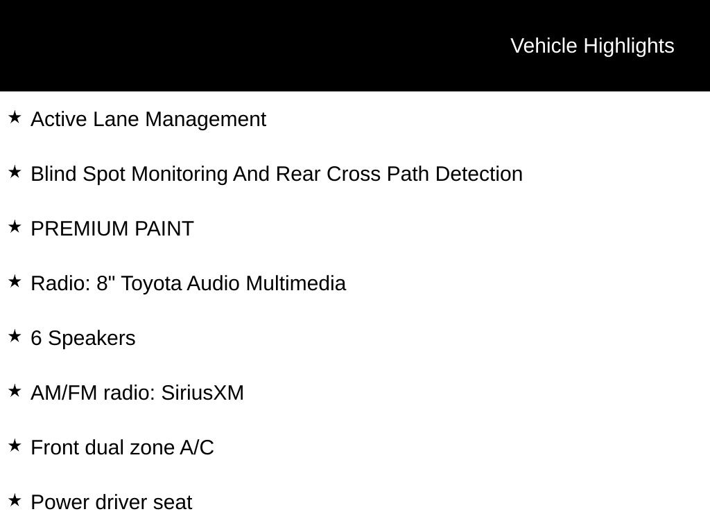 - Toyota Safety Sense 2.5+: Pre-Collision Sys w/Pedestrian Detection, Full-Speed Range Dynamic Radar Cruise Control, Lane Departure Alert w/Steering Assist, Lane Tracing Assist, Automatic High Beams, Road Sign Assist