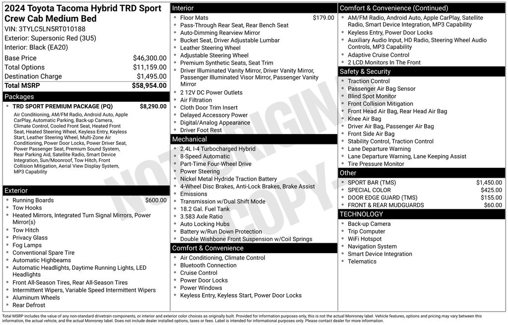 In addition to its impressive capabilities, this Tacoma Hybrid TRD Sport boasts a stunning Red exterior, complemented by the Sport Bar and Black Oval Tube Step for a bold, rugged appearance.